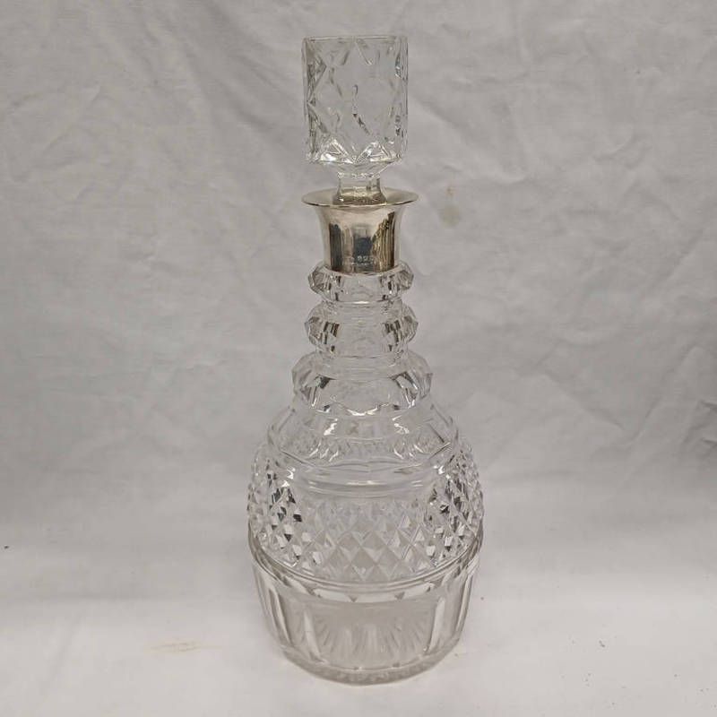 Cut glass decanter with silver mount, birmingham 1916