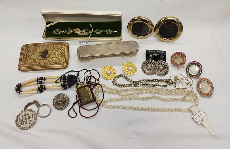 Scottish silver brooch set with moss agate, krementz green hardstone set bracelet, eastern gilt card case, etc