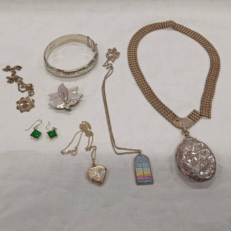 Silver bangle with engraved decoration, birmingham 1959, weight 18.7g, mexico alpaca mother of pearl brooch, silver pendant on chain, necklace & oval silver locket, pair of green stone earrings marked 925 silver locket on silver chain coloured pendant on 925 chain