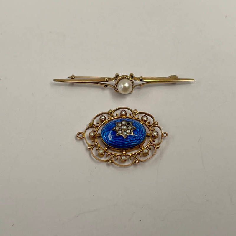 9ct gold seed pearl & enamel pendant & 9ct gold pearl set brooch