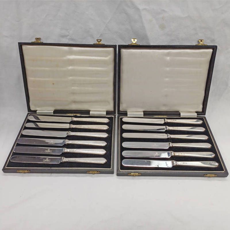 2 cased sets of 6 silver handled tea knives, 12 knives in all, birmingham 1965
