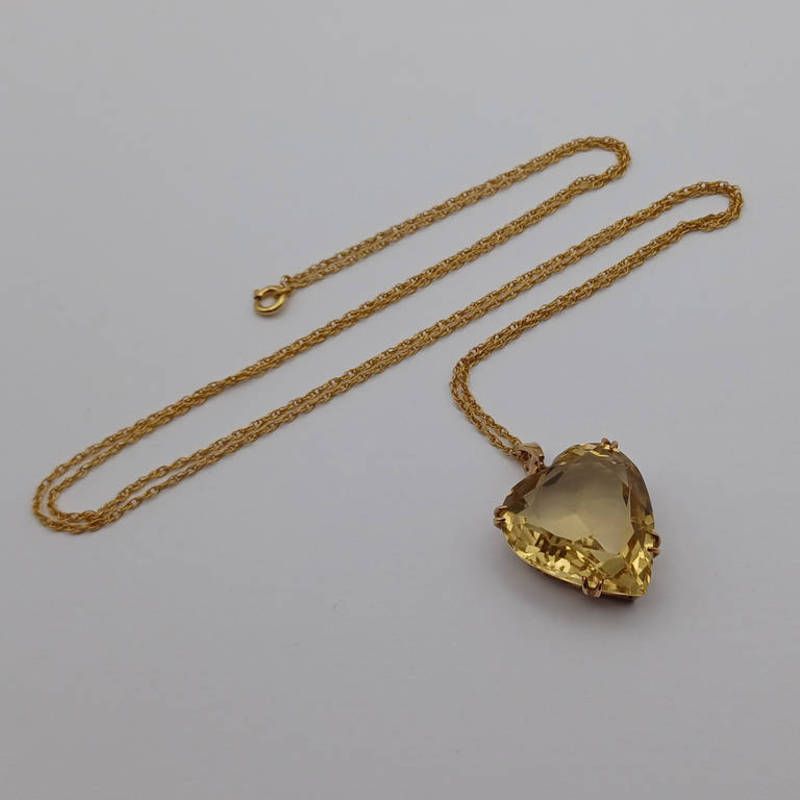 9ct gold mounted citrine heart shaped pendant on fine yellow metal chain. length 74 cms