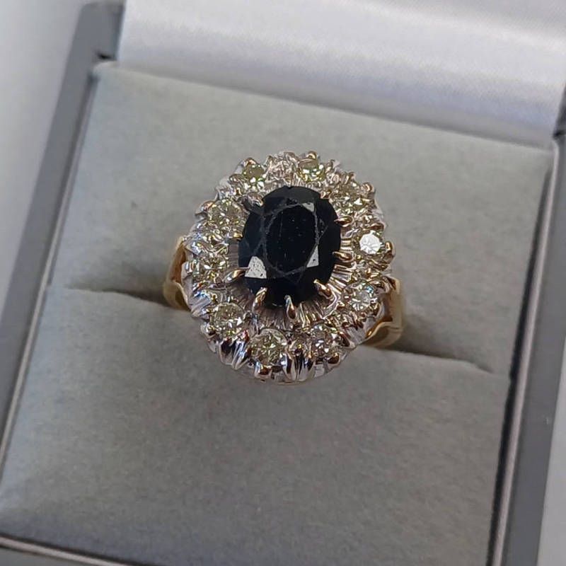 18ct gold sapphire & diamond cluster ring, the oval sapphire set within a surround of brilliant cut diamonds approx 0.8 carats in total, ring size l