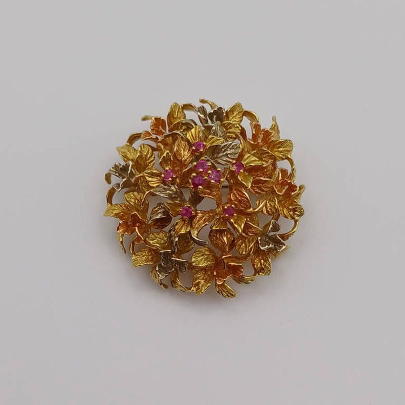 18ct gold ruby set circular brooch with leaf decoration & marked 750. 15.8 grams