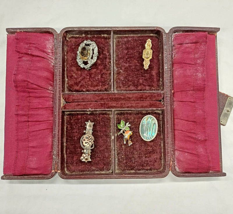 Enamelled & marcasite set bird brooch, 9ct gold brooch - 1.9 grams, silver horseshoe decorated brooch, mother of pearl silver set brooch, edinburgh hallmarked silver gem set brooch