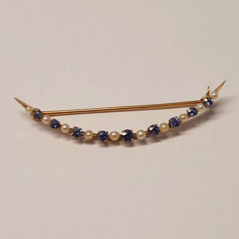 Gold pearl & sapphire crescent brooch - 6cm long, 4.0g