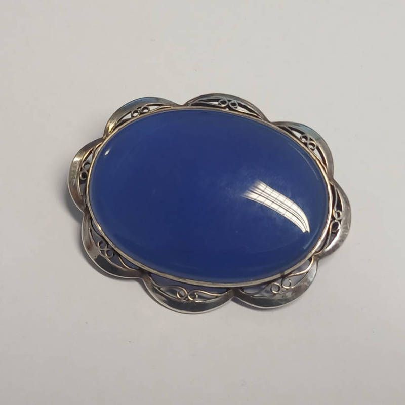 Silver oval blue chalcedony brooch with pierce work border by sydney & co. birmingham 1987 - 5.8cm long