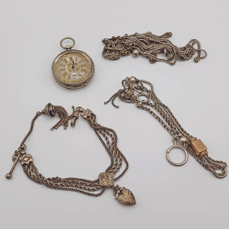 Silver fob watch with silver & gold dial, various chains & bracelets