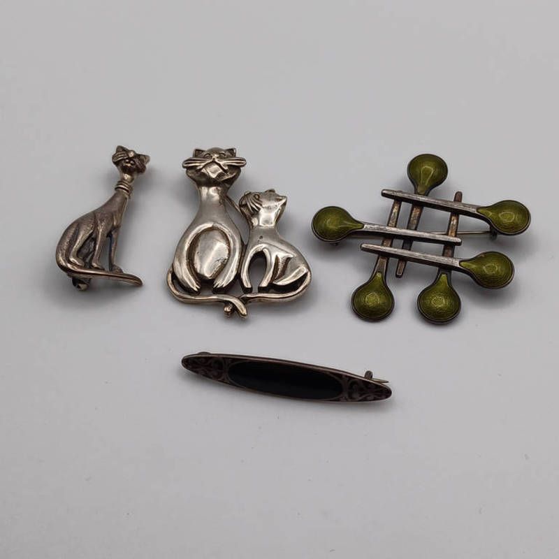 Arts & crafts style brooch marked made in norway, sterling 925, sitting cat brooch, 2 sitting cat brooches, marked 925 etc.