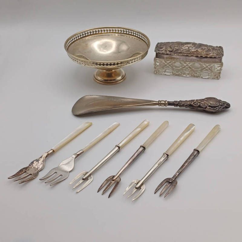 4 silver pickle forks with mother of pearl handles, 2 other pickle forks, silver handled shoe horn, silver topped cut glass dish, silver comport birmingham 1928. weighable silver 59g