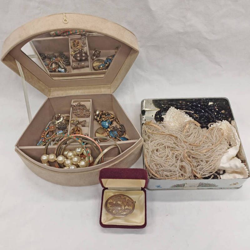 Sterling silver bracelet, various silver & other bangles, silver arts & crafts brooch, various jewellery, good selection bead work edgers etc