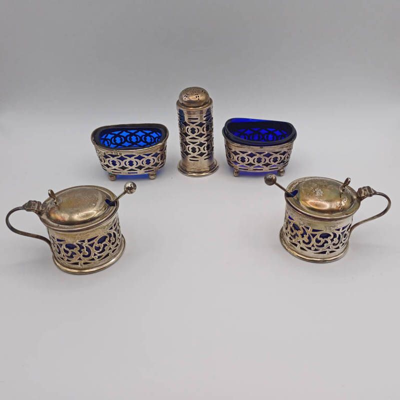 4 piece silver cruet & 2 silver spoons, birmingham 1904, oval silver cruet birmingham 1903, weighable silver 132 grams