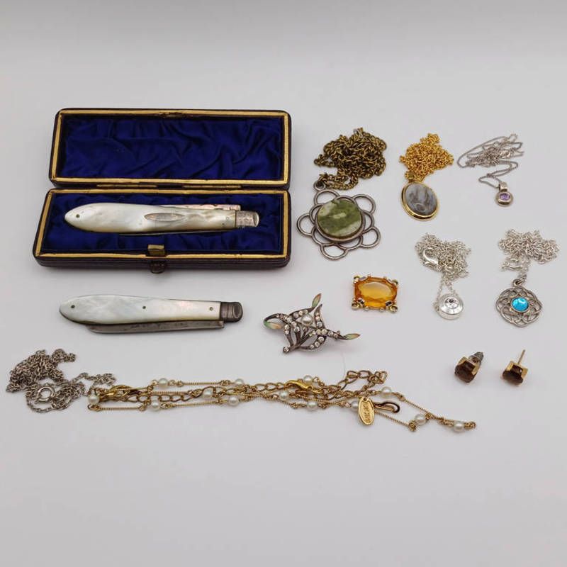 Paste pearl & gilt metal necklace chains etc, early 20th century sterling silver & enamel paste set brooch , 2 silver & mother of pearl apple knives