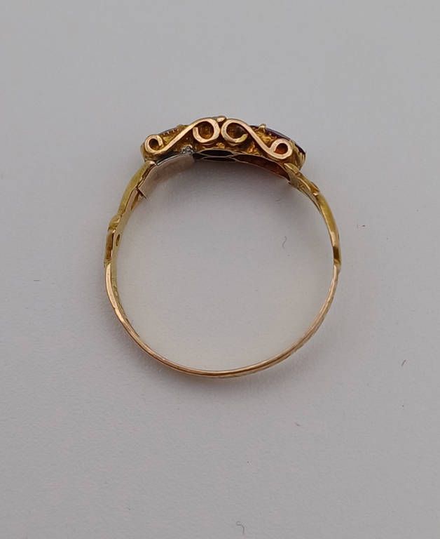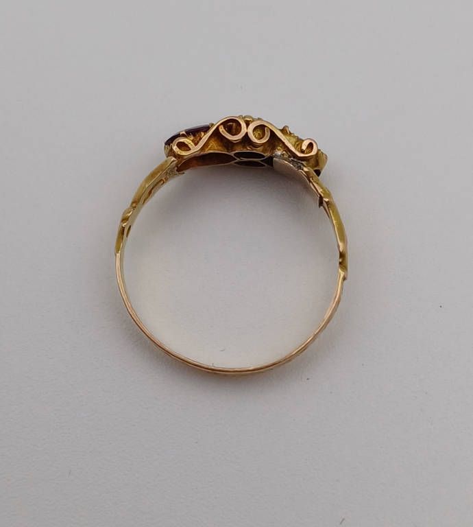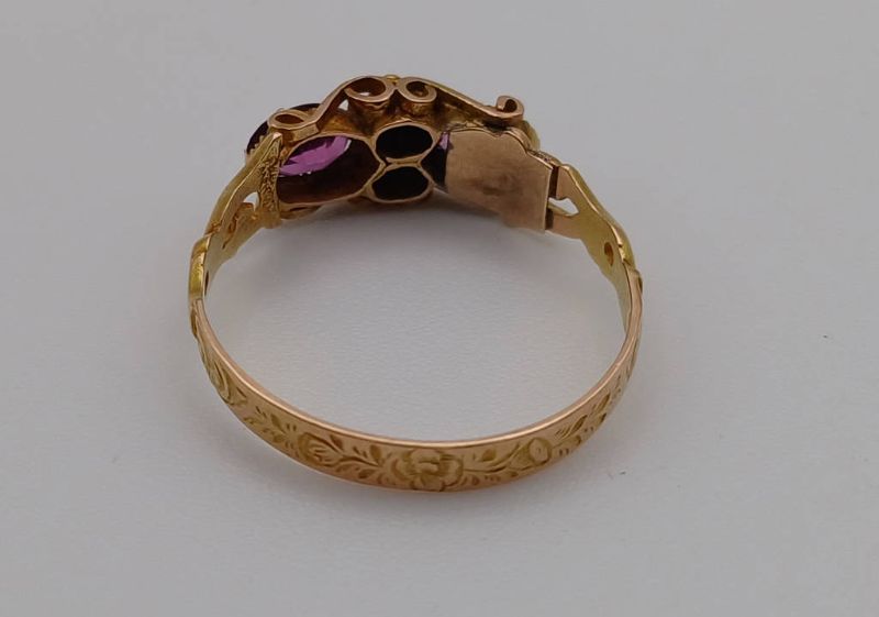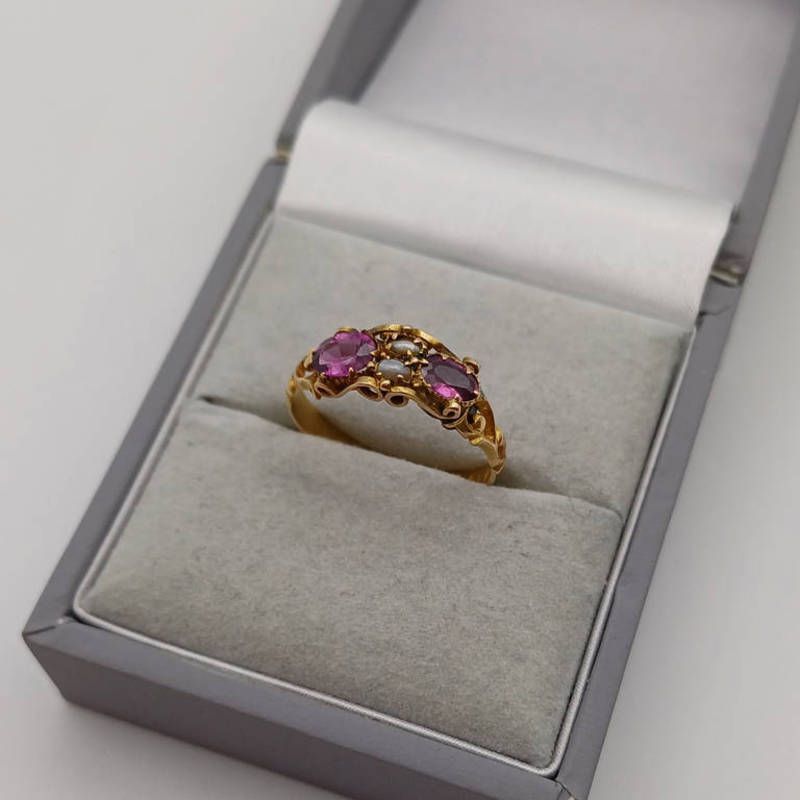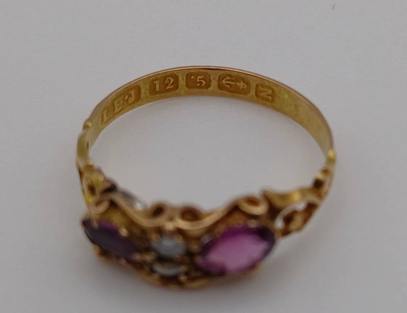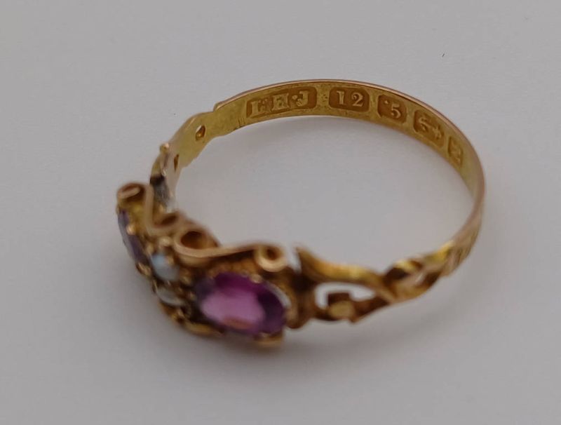 Mid 19th century 12 ct gold amethyst & seed pearl ring with pierced and engraved band, hallmarked 1862 - ring size m weight 1.4 grams