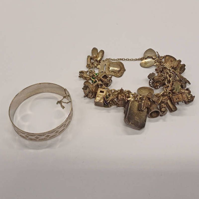 Silver charm bracelet with various silver, continental & other charms & a hallmarked silver bangle - 159g