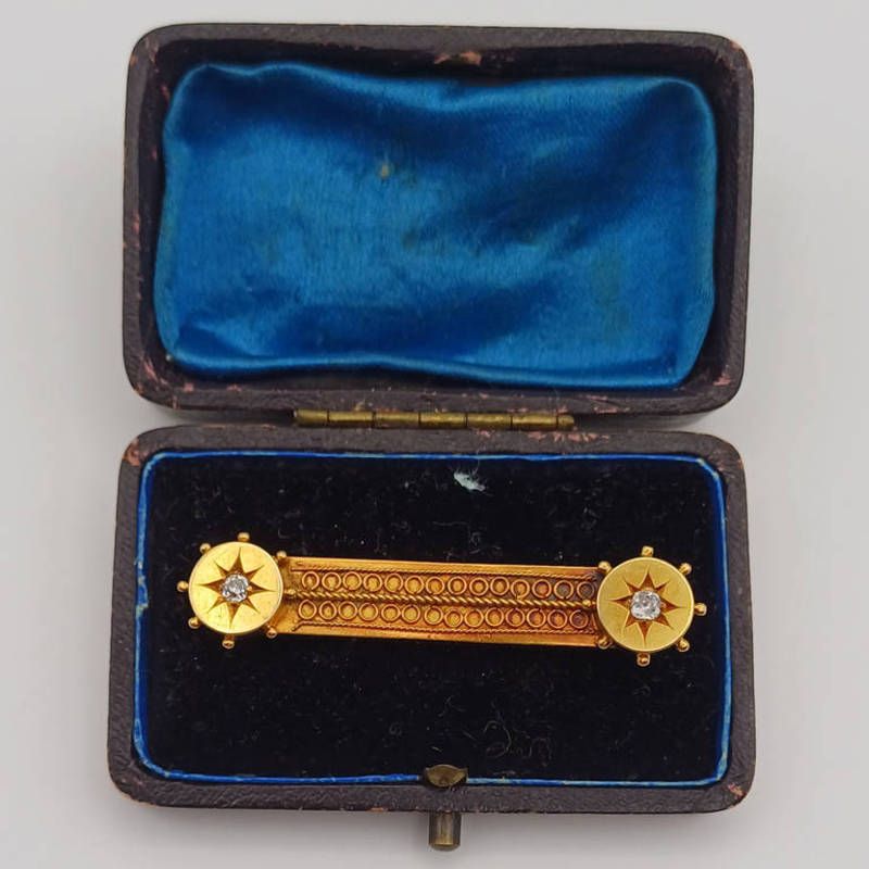 19th century gold etruscan style 2 stone diamond set brooch 6.3 grams
