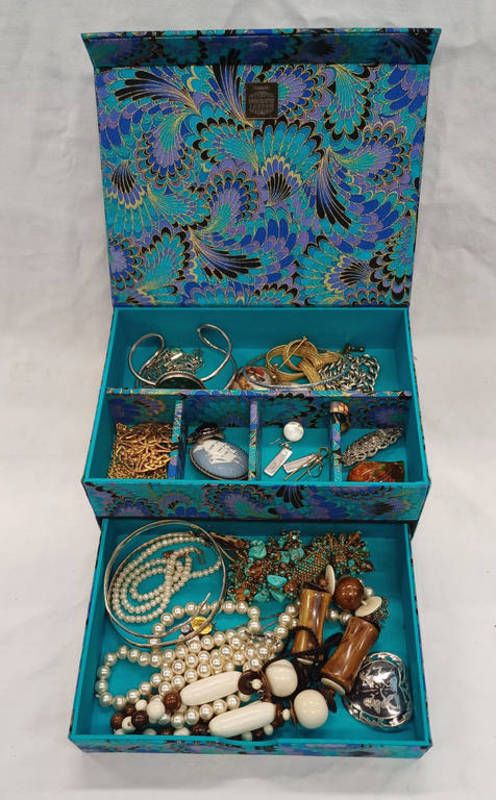 Blue jewellery box with futura wrist watch, arts & crafts bangle, arts & crafts brooch marked 925, sterling silver tortoise brooch, seiko wrist watch silver chain, white metal eastern cultured pearl bangle, & brooch, necklace etc.