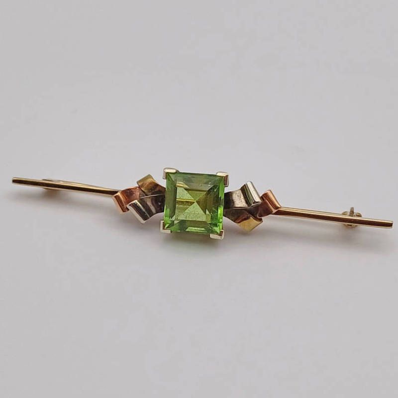9ct gold brooch with square cut peridot. 3.9 grams. 6cm