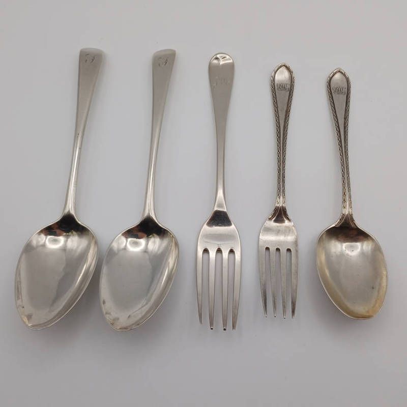 Silver teaspoon, 2 silver dessert spoons, london 1802, 2 silver forks, total weight 160 grams