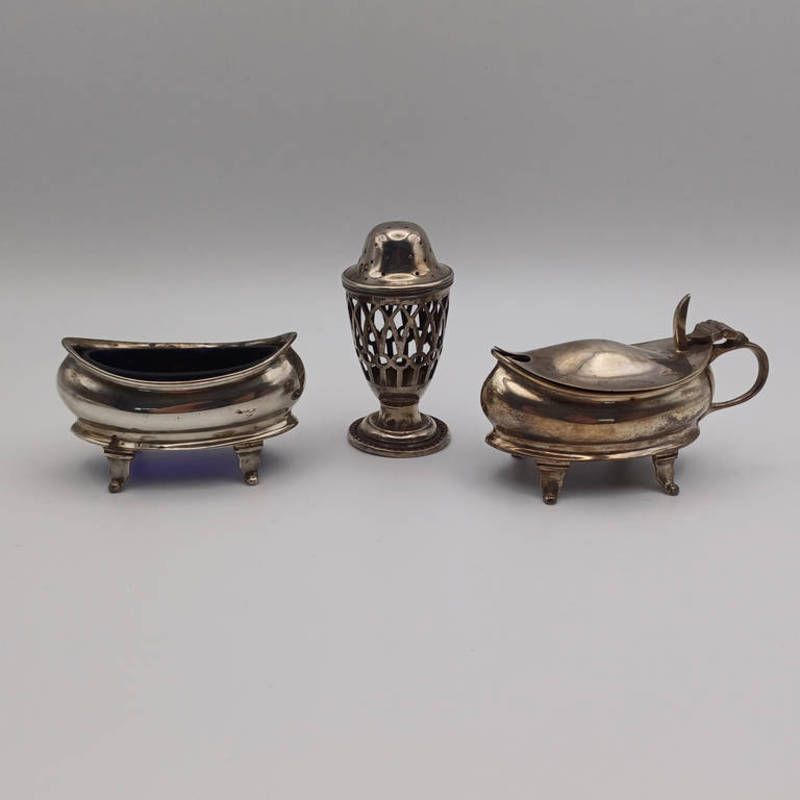 Oval silver salt & lidded silver mustard pot, birmingham 1918 & silver pepper, 98 grams