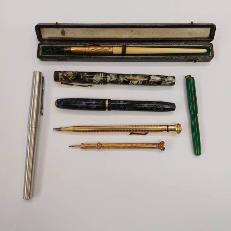 Gilt extending pencil holder wahl eversharp gold fitted pencil conway stewart gold nibbed pen, parked pen with 14k gold nib, miniature gold nibbed pen , cased pen