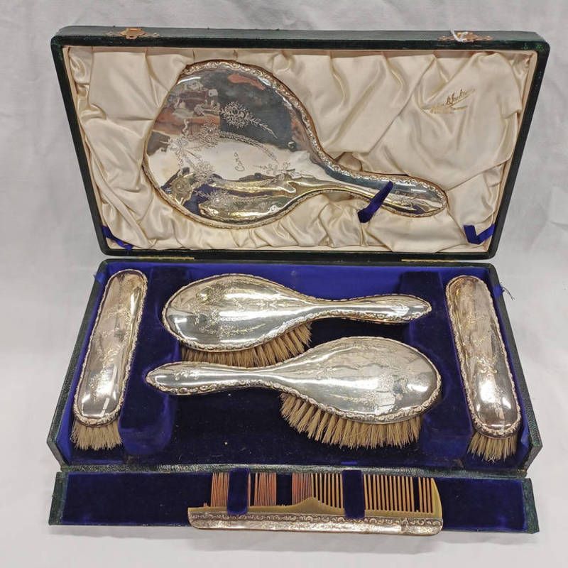 Silver 6 piece silver dressing set in fitted case, birmingham 1911., comb, birmingham 1910