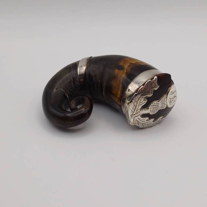 Scottish white metal mounted horn snuff mull with thistle decoration