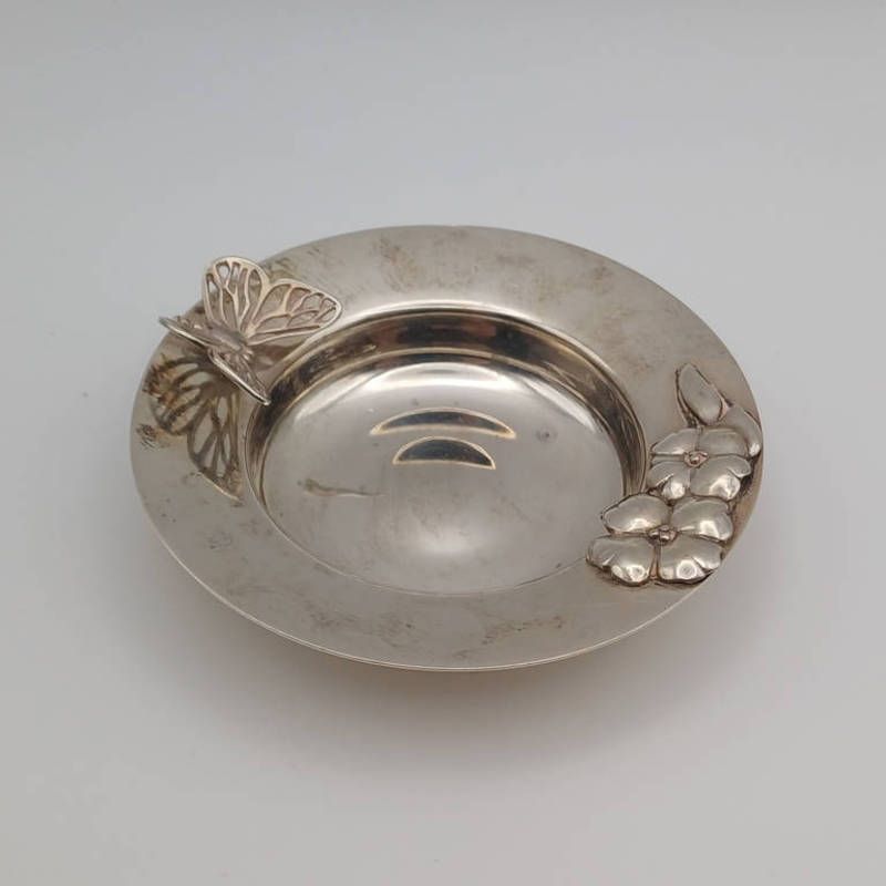 Silver circular pin dish decorated with butterfly & flowers by clive & clarissa cooke, london 1988, 8.3cm diameter, weight 52g