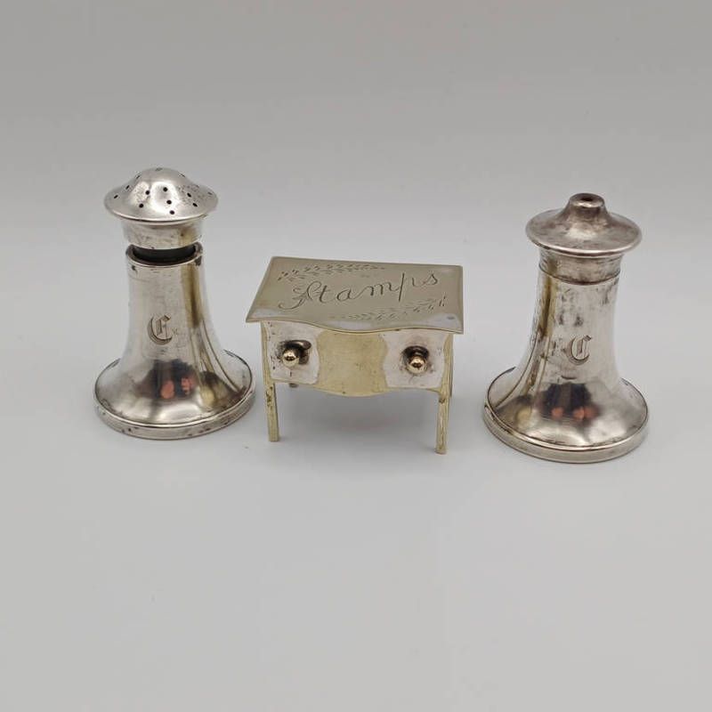 Silver plated stamp box with shaped lift-up lid & pair of silver cruets, birmingham 1930