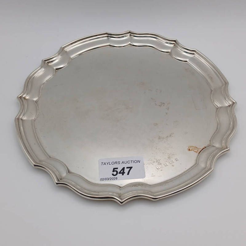 Circular silver plated salver with decorative border & 2 handles. diameter of salver 41 cms