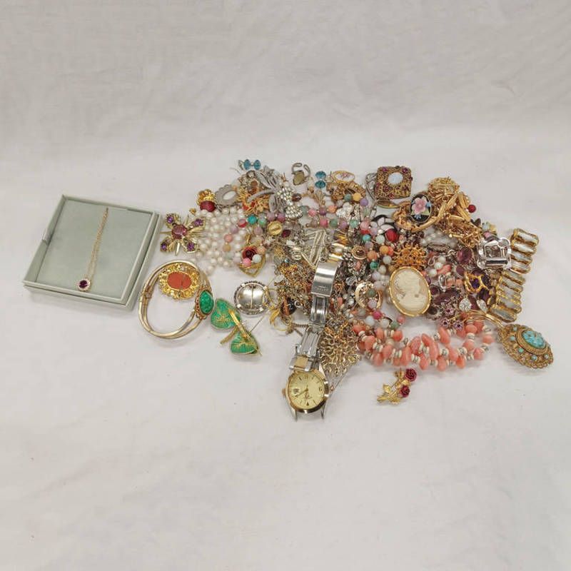 Pendant watch on chain, citizen wristwatch, pulser wristwatch, rotary wristwatch, various costume jewellery including green...