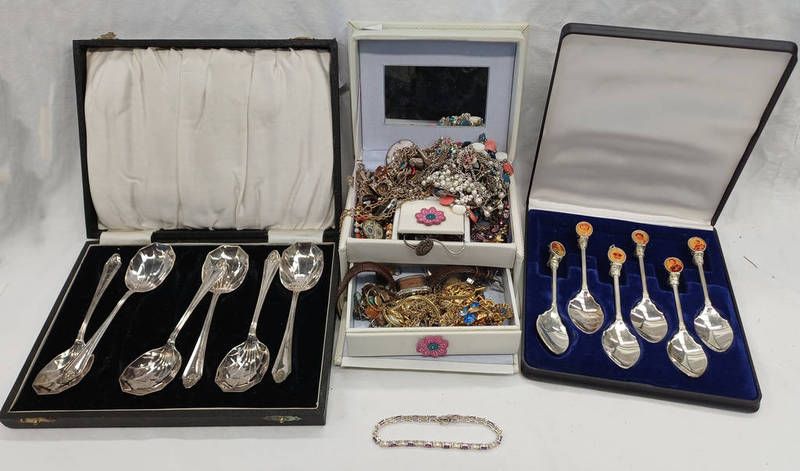 Silver charm bracelet, good selection of costume jewellery including rotary wristwatch, various rings, silver diamond & gem set bracelet, & 2 cased sets of spoons