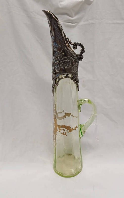 Late 19th or early 20th century pale green glass water jug with gilt decoration & white metal mounts, 48.5cm tall