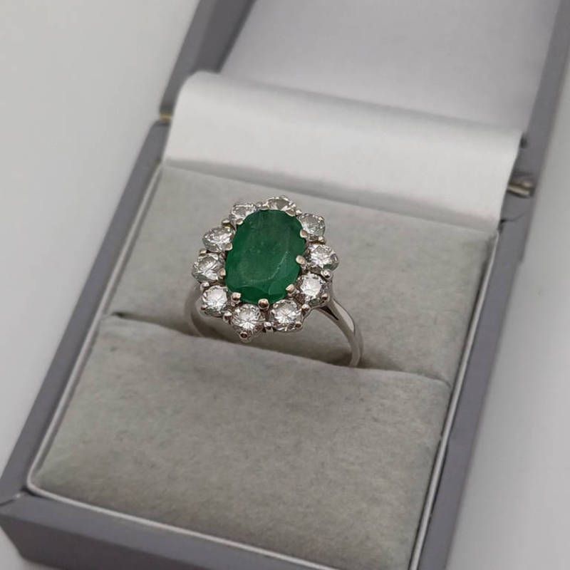 18ct gold emerald & diamond cluster ring, the oval cut emerald set within a surround of 10 brilliant cut diamonds, approx 1.4 carats in total - ring size n
