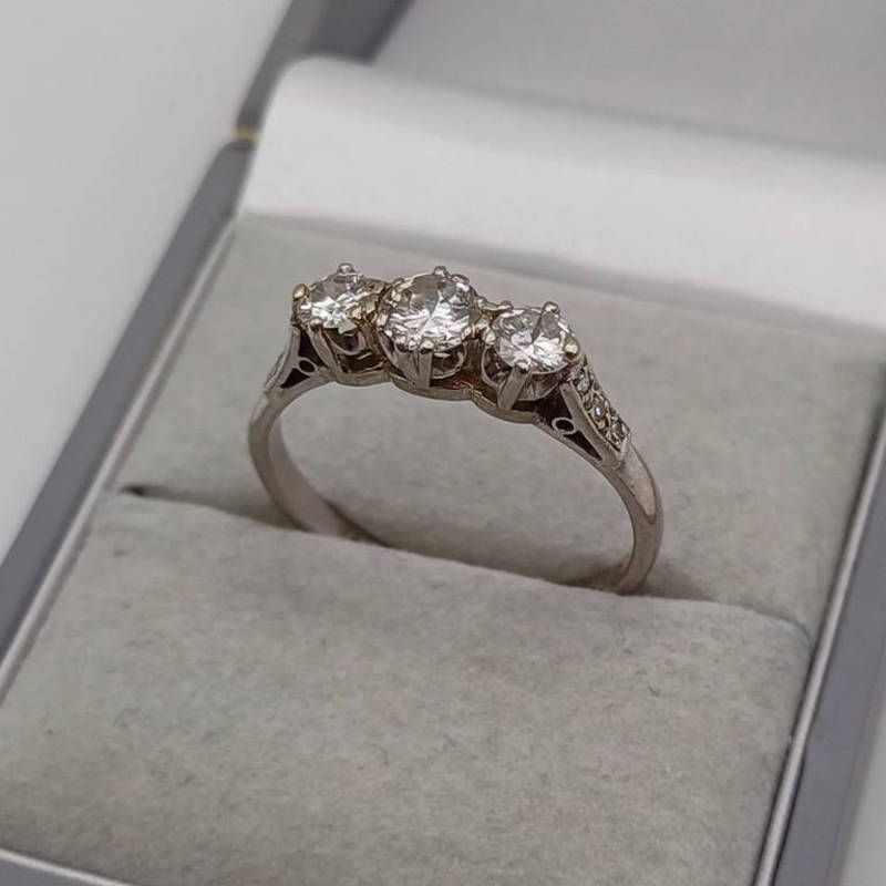 18ct gold 3 stone diamond set ring with diamond set shoulders, the 3 round cut diamonds approx 0.69 carats in total. 3.6 g. ring size q