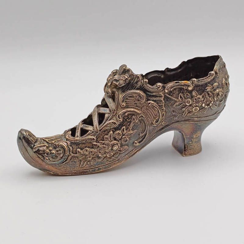Silver shoe with embossed decoration by h matthews, birmingham 1890
