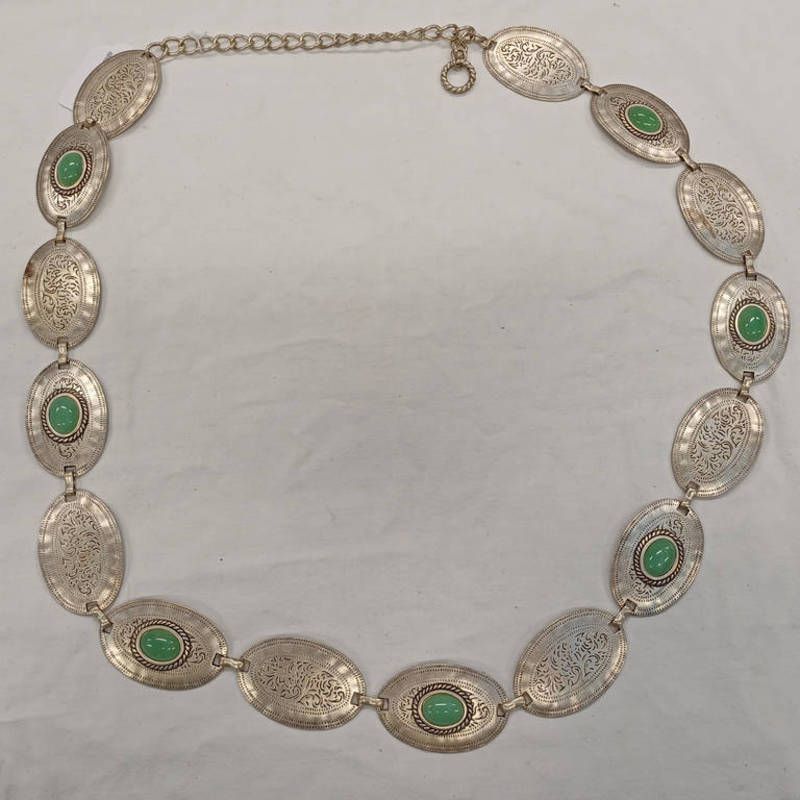 Green hardstone & metal necklace, total length 114cm