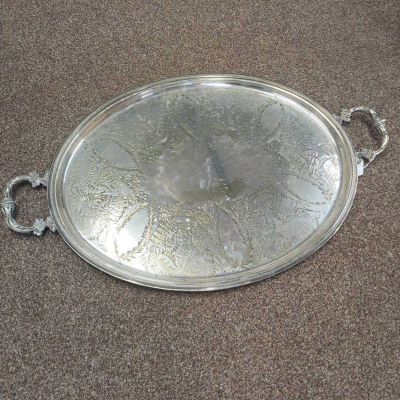 Oval silver plated 2 handled salver. max length handle to handle 76 cms with engraved decoration