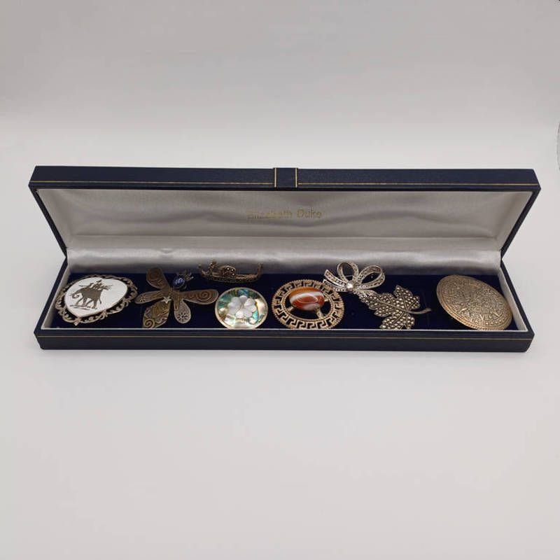 Banded agate set brooch in hallmarked setting, insect style brooch marked sterling, marcasite brooch marked silver, loop brooch marked sterling, alpaca mother of pearl brooch, silver boat brooch, silver mexico brooch, sterling silver sian brooch