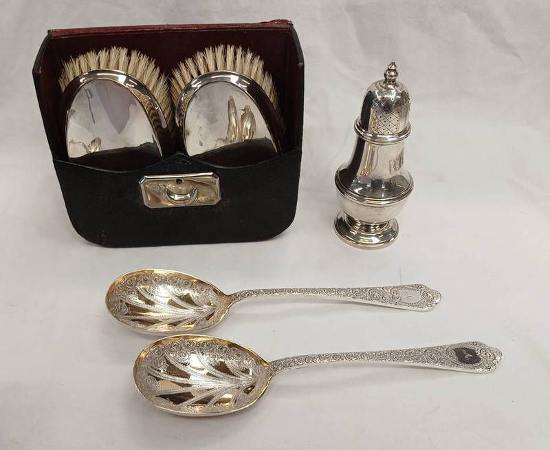 A silver sugar sifter, birmingham 1974. 91g, cased pair of silver mounted brushes, chester 1918 & a pair of silver plated serving spoons