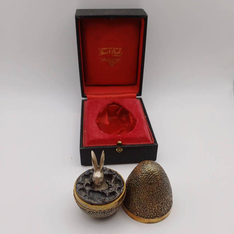Stuart devlin silver - gilt egg opening to reveal a rabbit in asprey box, hallmarked, london 1969