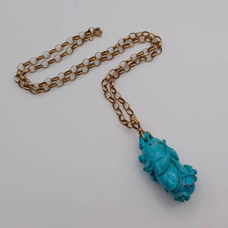 Carved turquoise pendant on 9ct gold chain, length of chain 45cm, chain 5.1g